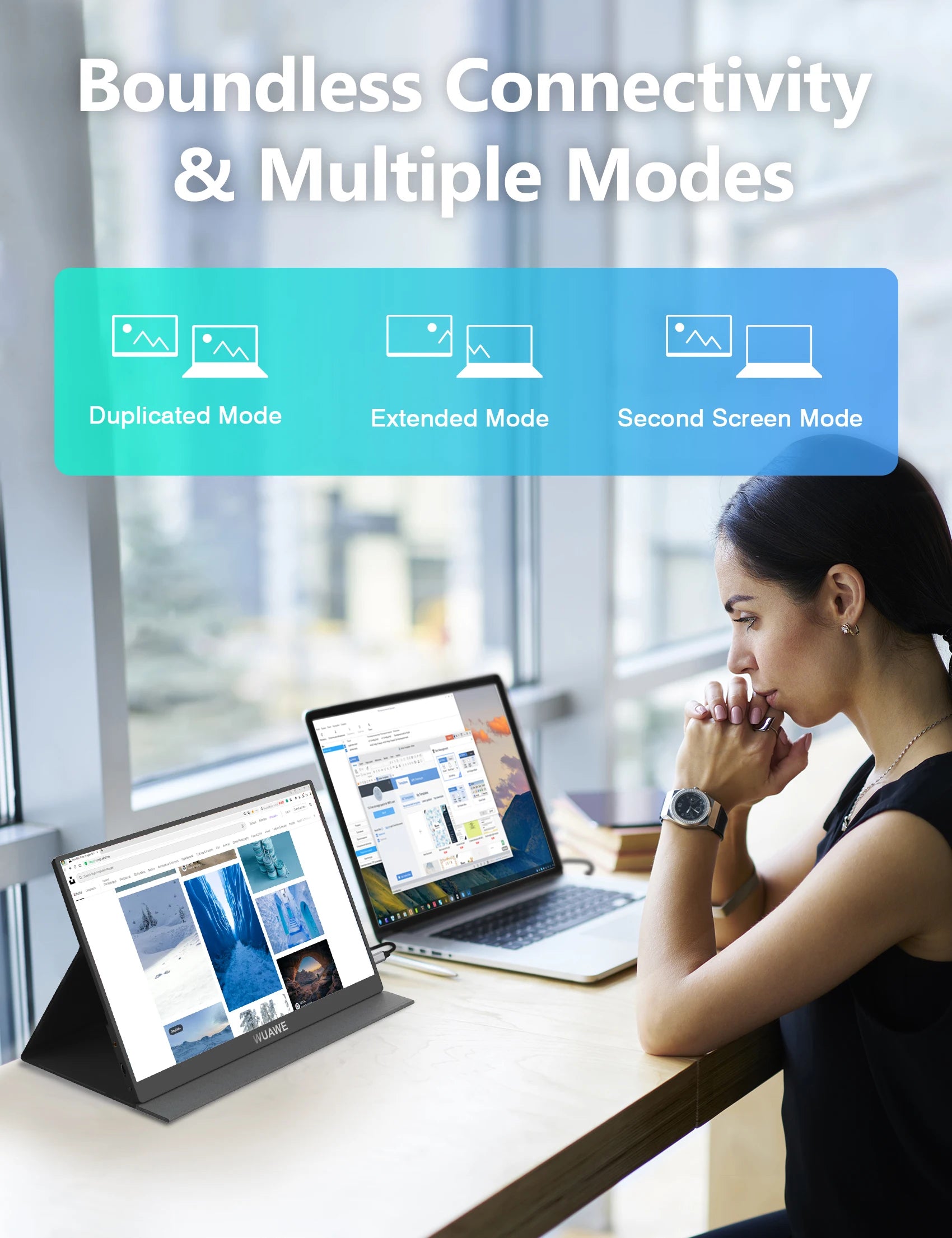 Multiple Display Mode: This portable display allows you to customize your workspace to meet your needs with multiple display modes, including duplicate, extended, second screen, and vertical display. Plus, with a VESA mount on the back, you can easily attach it to a VESA stand and optimize your workflow. Whether you're a creative professional, gamer, or on-the-go worker, our mobile monitor for laptop is the perfect solution for maximizing your efficiency and getting more done in less time.