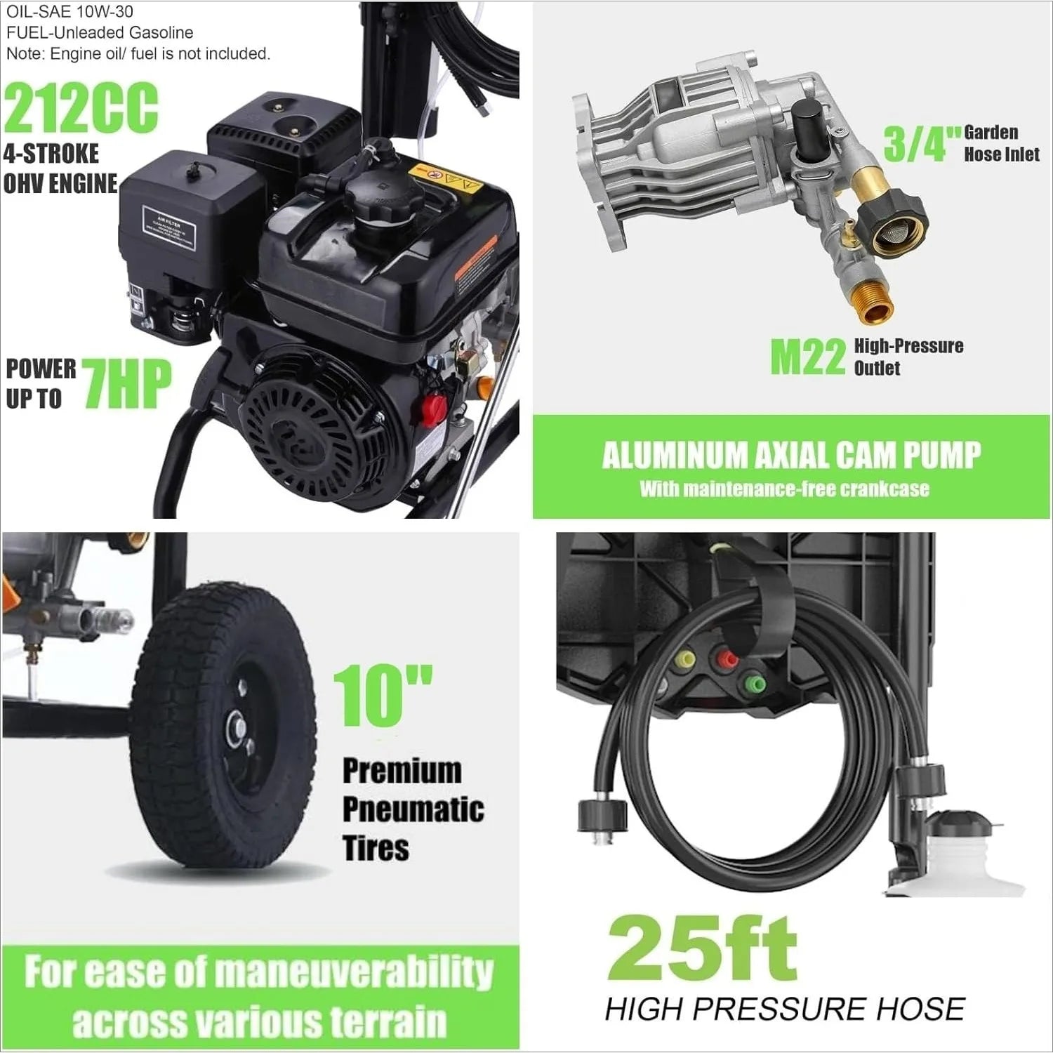 - Efficient Gasoline Engine:This gas pressure washer is powered by a rugged 7HP 4-stroke 212cc gasoline engine and recoil start system,it is paired with a durable axial cam pump,which is highly reliable and designed for heavy workloads,not only powerful,but also easy to start and with minimal maintenance costs,ensuring years of continuous operation,and factory integrity testing to ensure reliable performance.CARB compliant.Cleaning power is 100% higher than electric pressure washer.