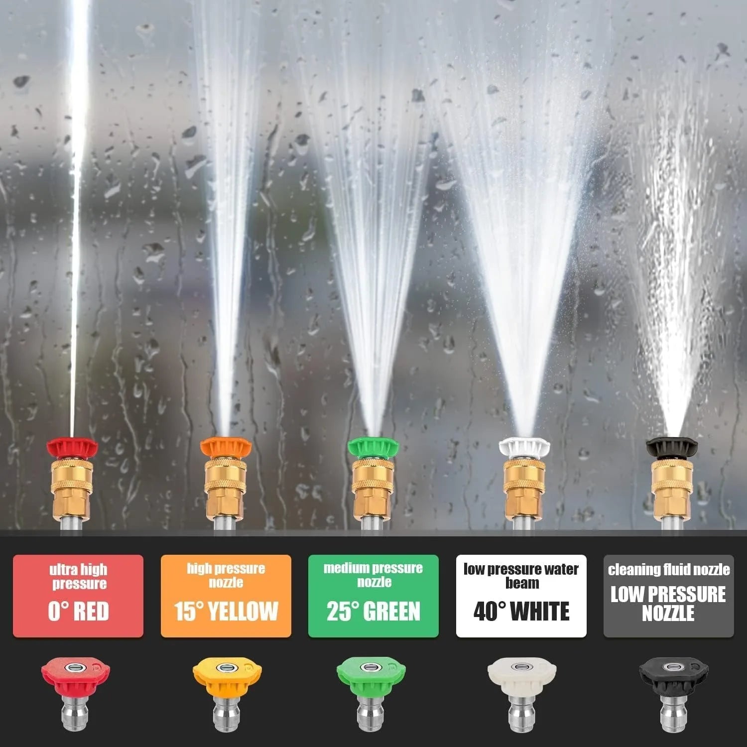 - Versatile Cleaning Options: The pressure washer includes 5 quick-connect nozzles (0º,15º, 25º, 40º, 60º, and soap) to tackle different cleaning tasks, such as porches, driveways, patios, and even vehicles, providing flexibility for various cleaning needs.1L soap tank with adjustable switch-use to spray soaps and detergents.