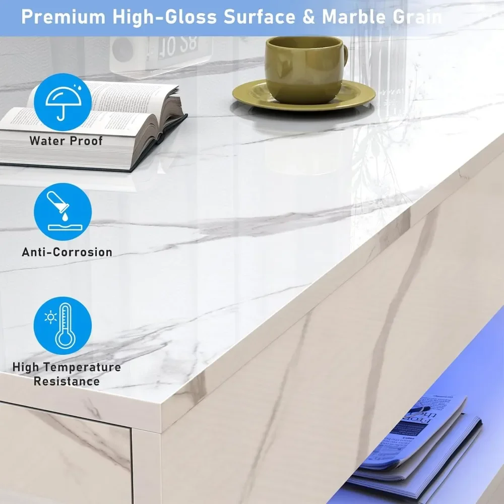 - 47 Inch Large Coffee Table: Our LED coffee table is designed with a 2-tier appearance, and features a classic and beautiful marble finish, which adds lots of beauty. Simple lines design connect multiple corners to create a simple and generous style, which is very suitable for living rooms, offices, apartments, etc.