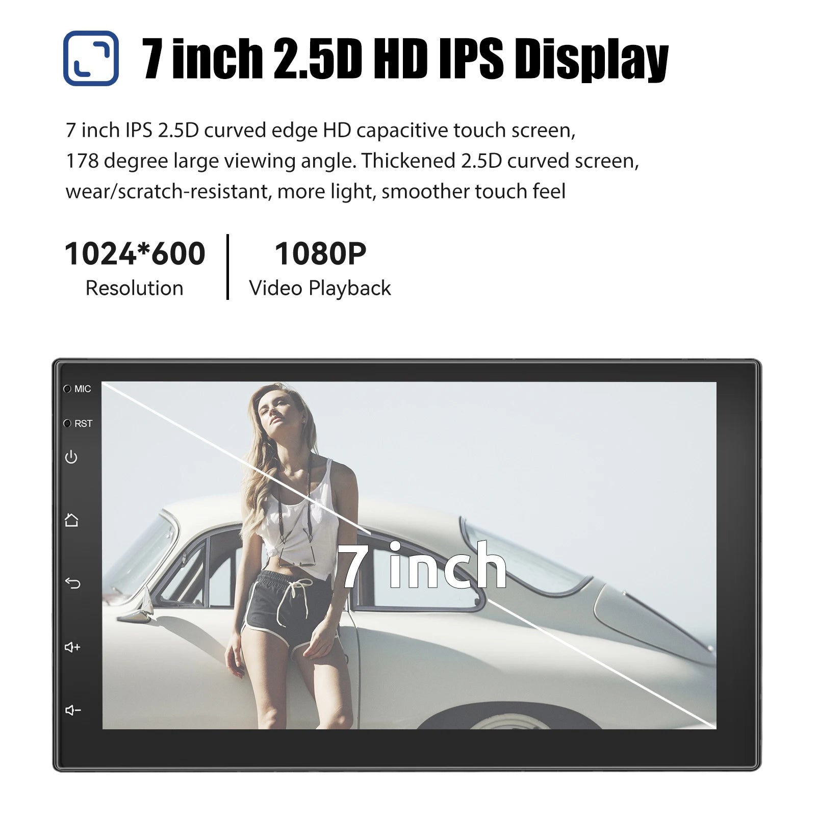 7 Inch 2 DIN Android 14 Car Radio: The Android car radio with 7 inch IPS capacitive touch screen, 2GB RAM and 32GB ROM / 4GB RAM and 64GB ROM provides enough space to download your favourite apps and videos, so driving won't be boring anymore. With two USB ports, it supports fast mobile phone charging. With the rear microphone input, you can add a microphone to make your voice clearer (not included).