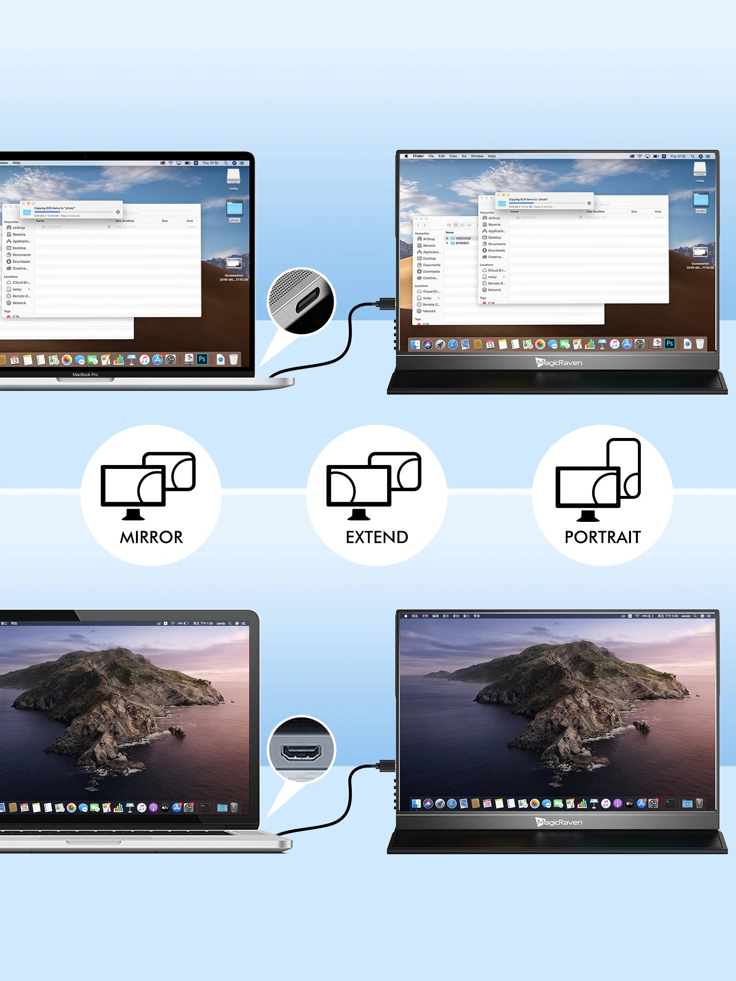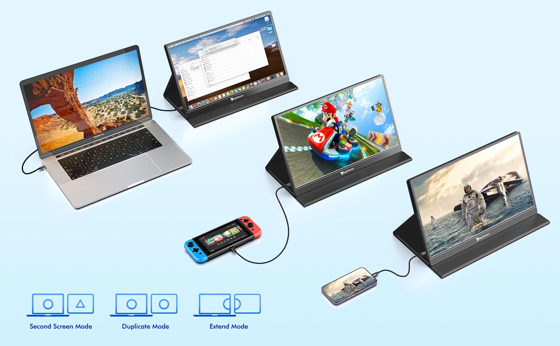 The dual monitor is plug-and-play without any driver installation. This laptop extend monitor provides 2 USB-C 3.2 ports and a HDMI 2.0 port, allowing you to connect to most devices with US-C 3.1 Gen2 or HDMI 2.0. Use USB-C 3.1 Gen2 cable or HDMI 2.0 cable (All including in package) for video transmission. Use USB-C able for power transmission (DON'T USE MICRO-USB Port to GET POWER)