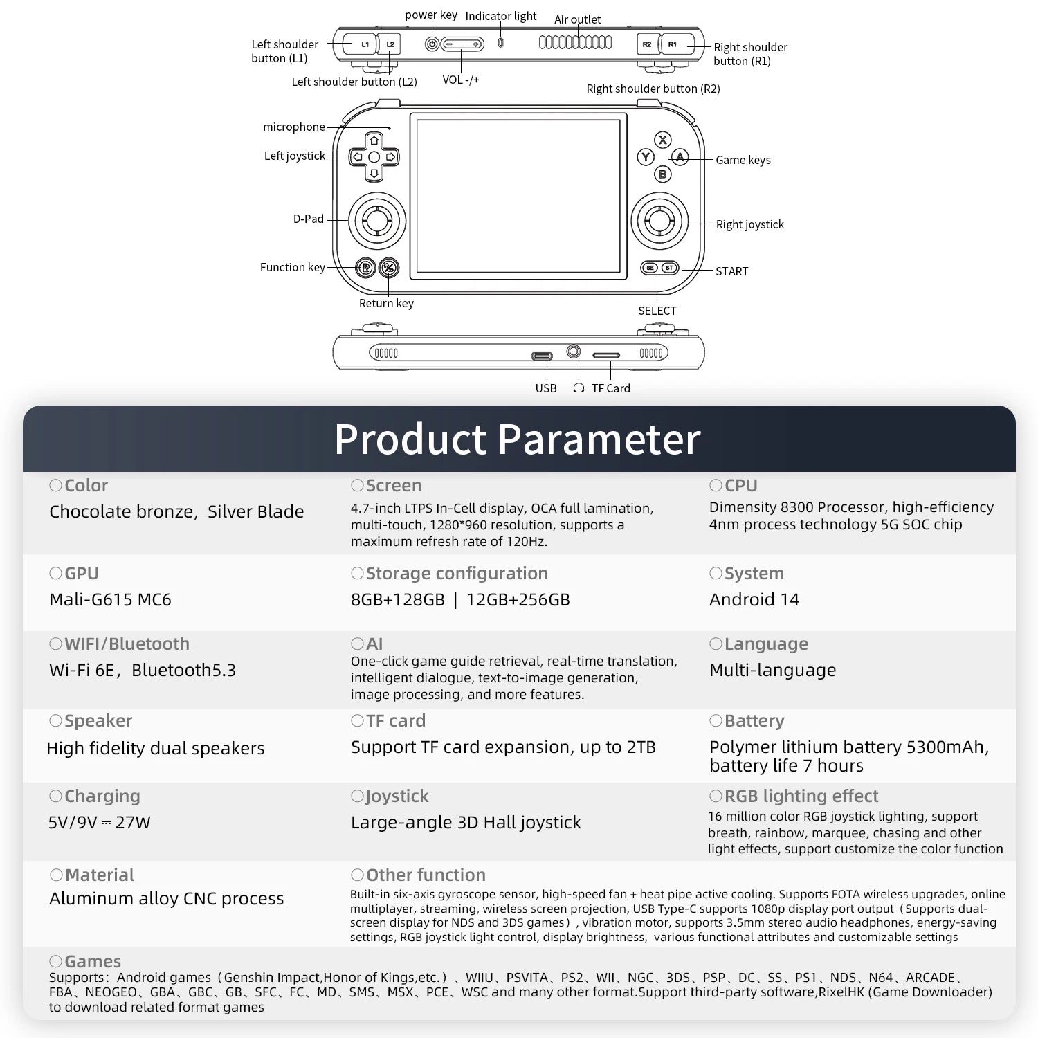 The RG 477M is a high-performance handheld gaming device with a sleek aluminum alloy CNC-machined body, available in Chocolate Bronzeand Silver Bladecolor options.