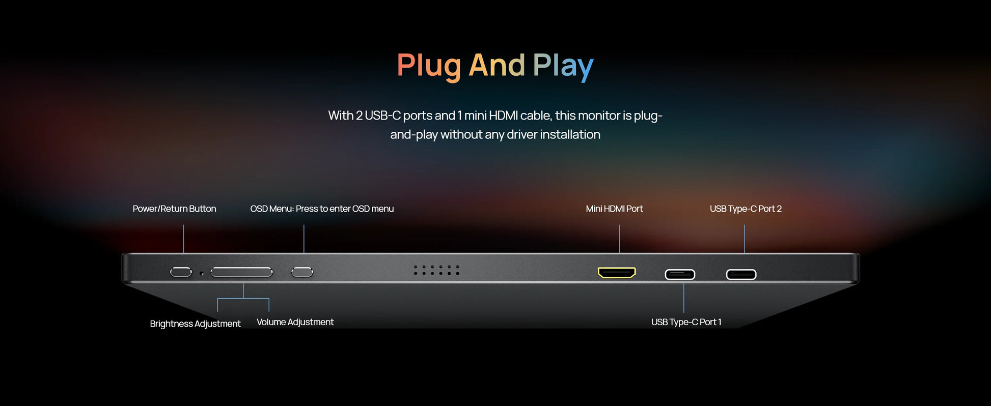 - 【Multi-Port Compatibility】:This portable monitor is equipped with dual USB-C ports on both sides and a mini HDMI port, compatible with a wide range of devices: Mac, laptops, desktops, Switch, PS, Xbox, phones (with Type-C port; for iPhone: a Lightning to HDMI adapter is required), etc.