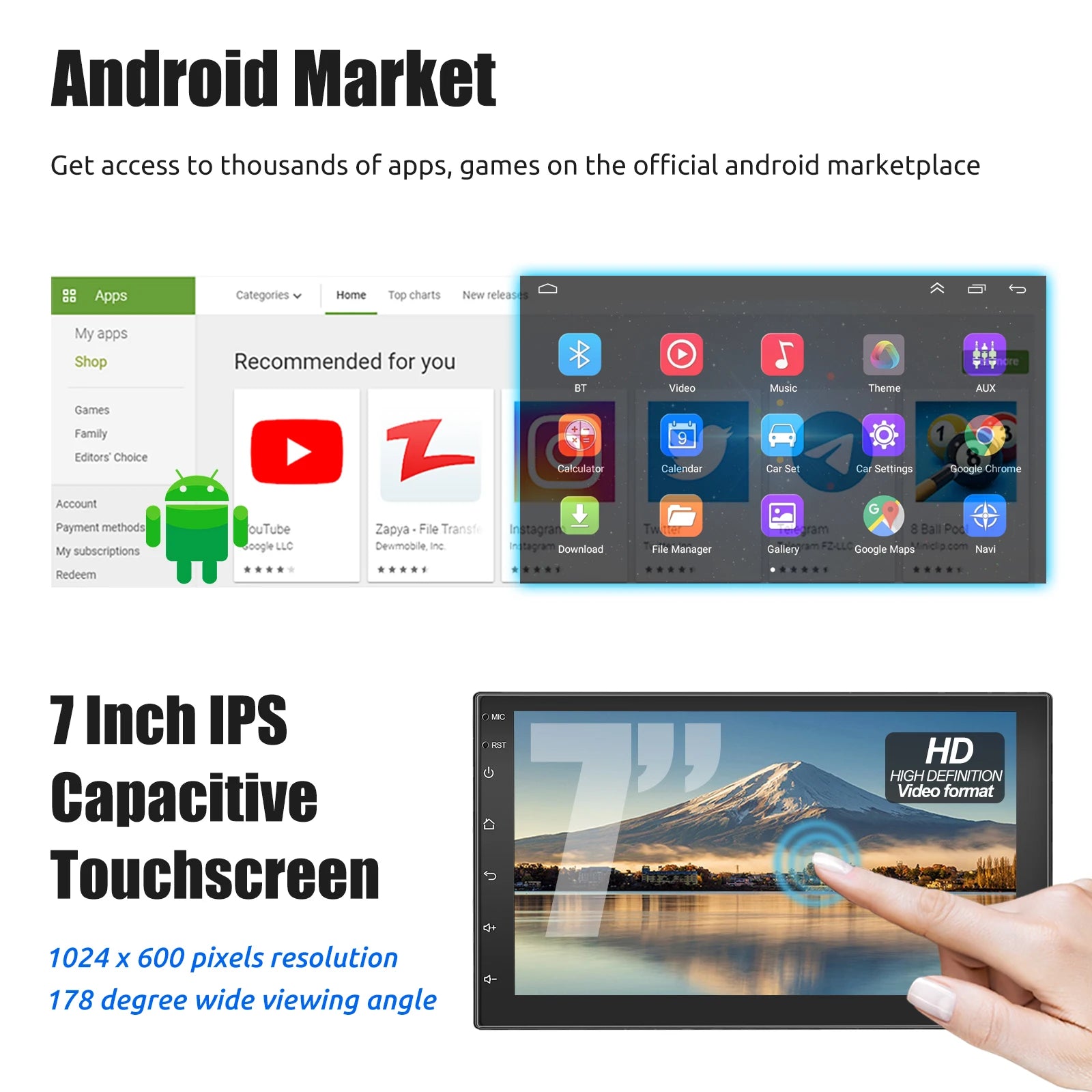 2 DIN Android Car Radio: The Android car radio with IPS capacitive touch screen, 64G ROM provides enough space to download your favourite apps and videos, so driving won't be boring anymore. With two USB ports, it supports fast mobile phone charging. With the rear microphone input, you can add a microphone to make your voice clearer (optional).