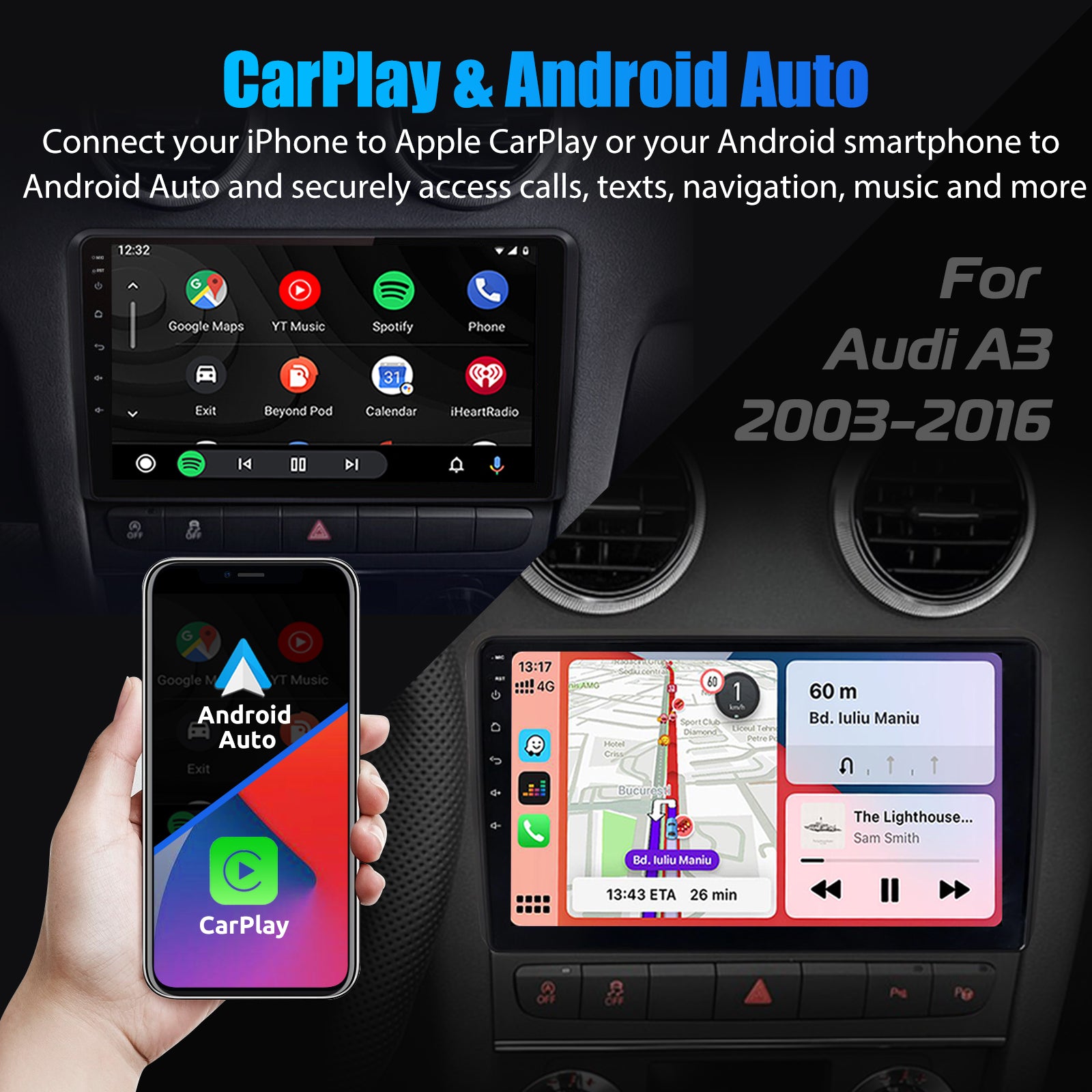 9 Inch Android 13 Car RadioFor Audi A3 8P (2003-2012):The Android car radio with 9" 1280*720 2.5D IPS capacitive touch screen, 32G/64GB ROM allows you to download your favorite apps and videos, so that driving will never be boring .No additional frame, no cable change, plug and play.