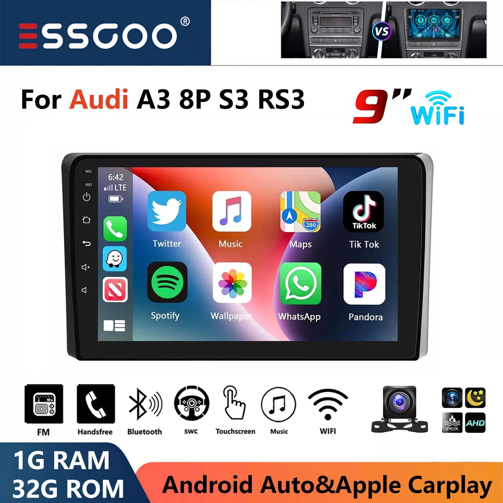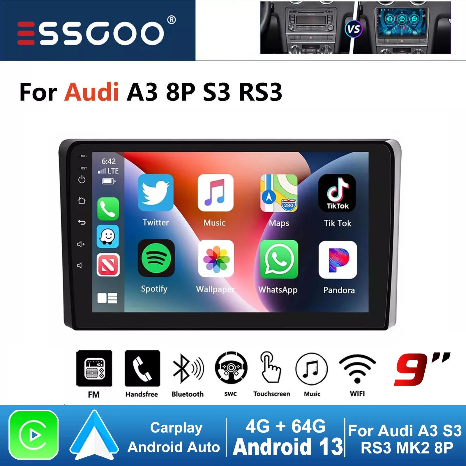 ESSGOO 9" Carplay AndroidAuto Car Stereo Multimedia Player Radio Android 13 GPS SAT Navi Wifi BT FM RDS For Audi A3 8P 2003-2013