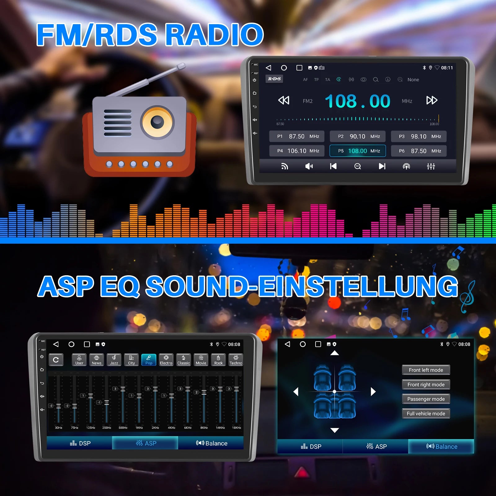 RDS/FM Radio & Bluetooth & ASP Sound Setting: Supports Bluetooth 4.1, with built-in microphone so you can make hands-free calls while driving. Support access to phone book, music playback interface, etc. RDS supported. You can save 18 FM radio stations. Built-in ASP chip. Supports 32-band EQ setting, which can be adjusted according to your personal preference. Which is very similar to your original sound. 4 x 45W amplifier, surround sound and subwoofer output