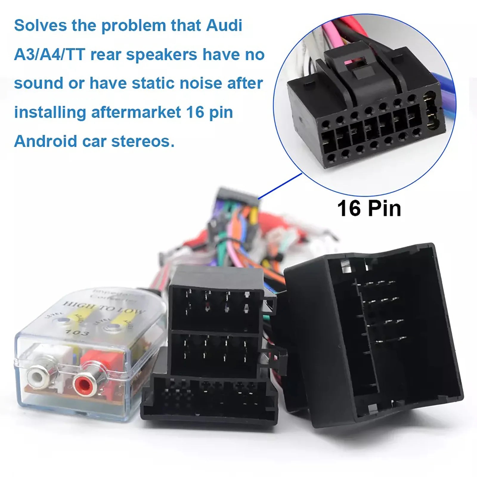 High Low Impedance Coverter Audio Adaptor: This harness solves the problem that amplified Audi A3/A4/TT models have no sound or have static noise after installing aftermarket 16 pin android car stereos. Designed for adapting the Audi loom to RCA low input for use with BOSE or Active Sub System. This Quad-lock harness adapter comes with High to Low Impedance Converters. It's for Audi A3/A4/TT models with rear speakers have no sound or have static noise after installing aftermarket car stereos.
