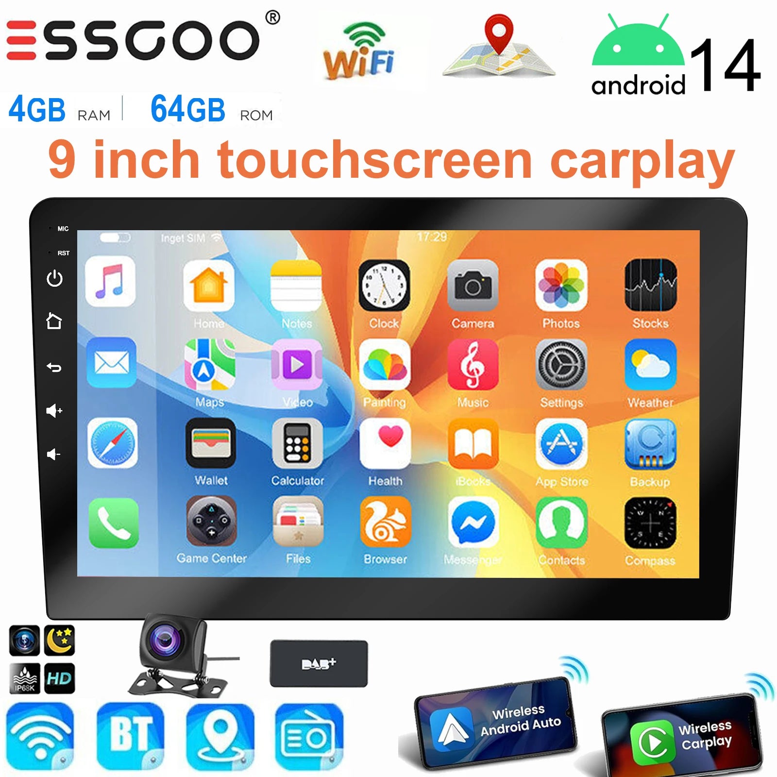 ESSGOO 9 Inch touchscreen 2 DIN Car stereo radio Android 14 Wireless Carplay Android auto play GPS Navi WiFi FM RDS SWC BT USB