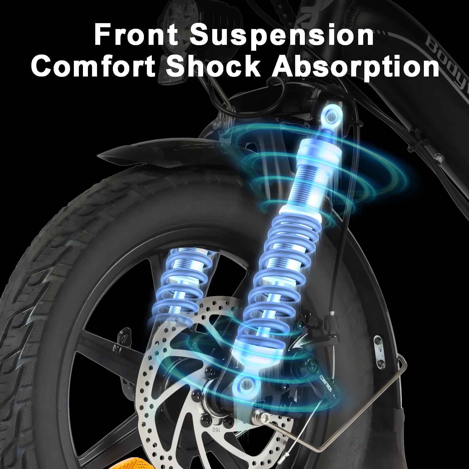 Front and rear dual disc brakes for reliable stopping. Bright LED headlight + rear light. 14" anti-puncture tires with shock absorption. Ride safely day or night.