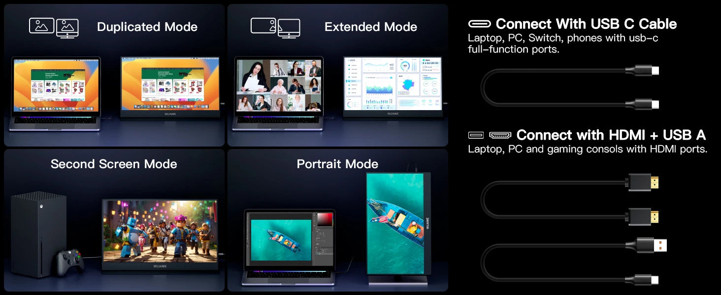Multiple Display Modes: This portable display allows you to customize your workspace with various display modes to suit your needs, including duplicate, extend, second screen, and vertical display. Additionally, the VESA mount on the back makes it easy to attach to a VESA stand, optimizing your workflow. Whether you’re a creative professional, gamer, or on-the-go worker, our laptop mobile monitor is the perfect solution for boosting efficiency and getting more done with less time.