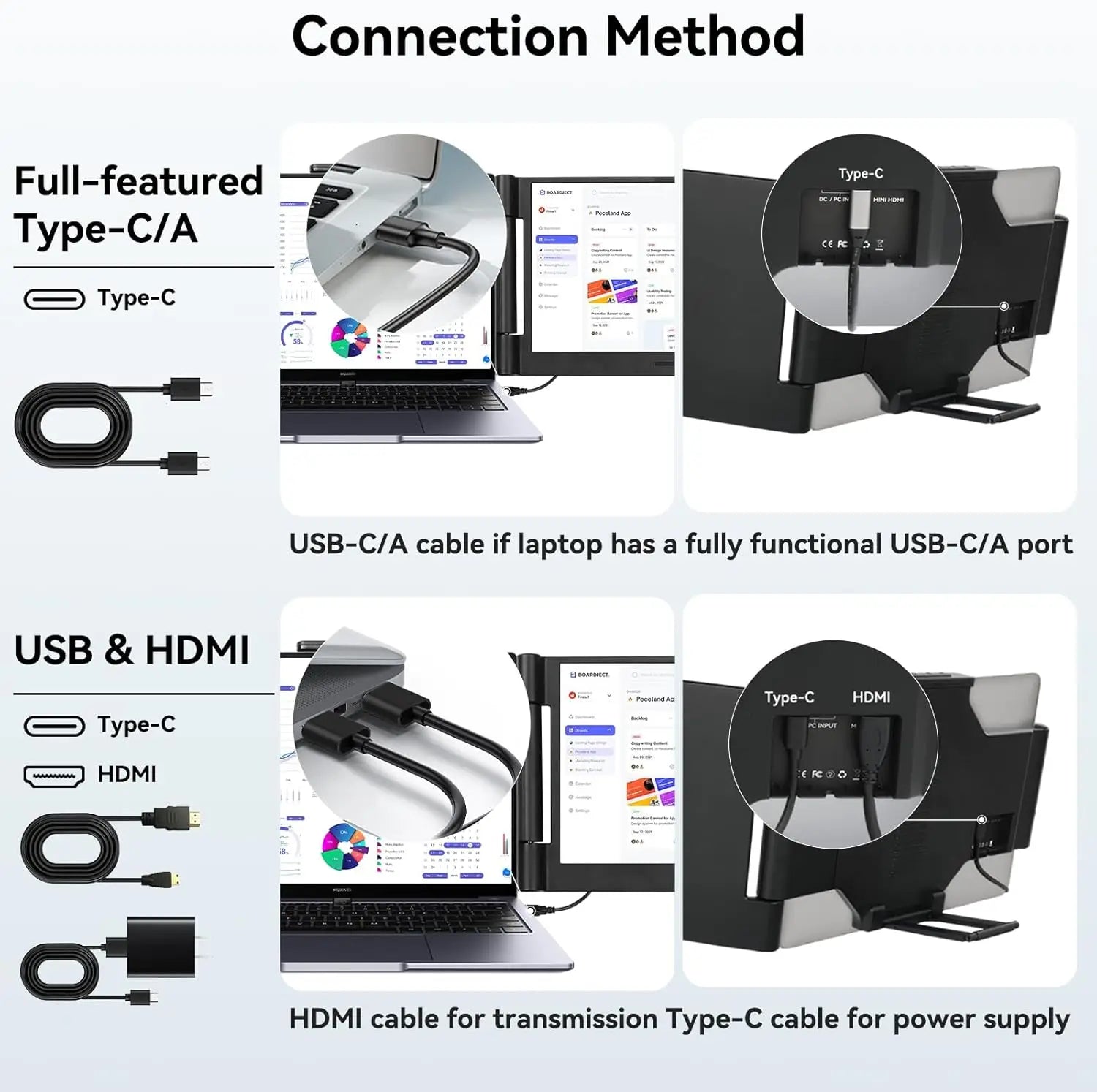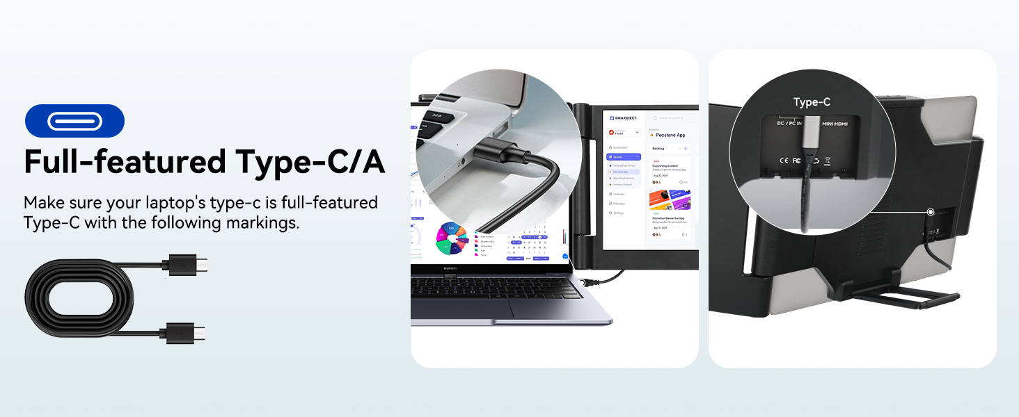 šš®š¬ššØš¦šš«-ššš§šš«š¢š šš®š©š©šØš«š: Rest assured with a 1-year support on our laptop screen extender. If you notice missing accessories or have inquiries about connectivity, feel free to contact us, and we are here to provide a prompt solution within 24 hours. Note 1: The laptops need to support a full-featured USB-C/A or HDMI port. Note 2: If one screen displays "No Signal," it means the laptop output power is insufficient, requiring extra power for that screen. Note 3: When using an HDMI cable, make sure to connect the dual USB-C port cable to the portable monitor and the DC charger.
