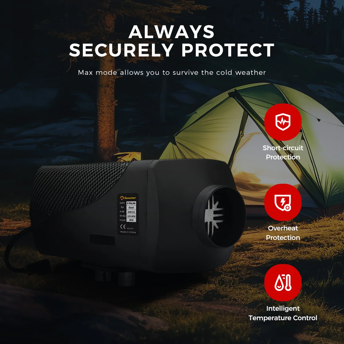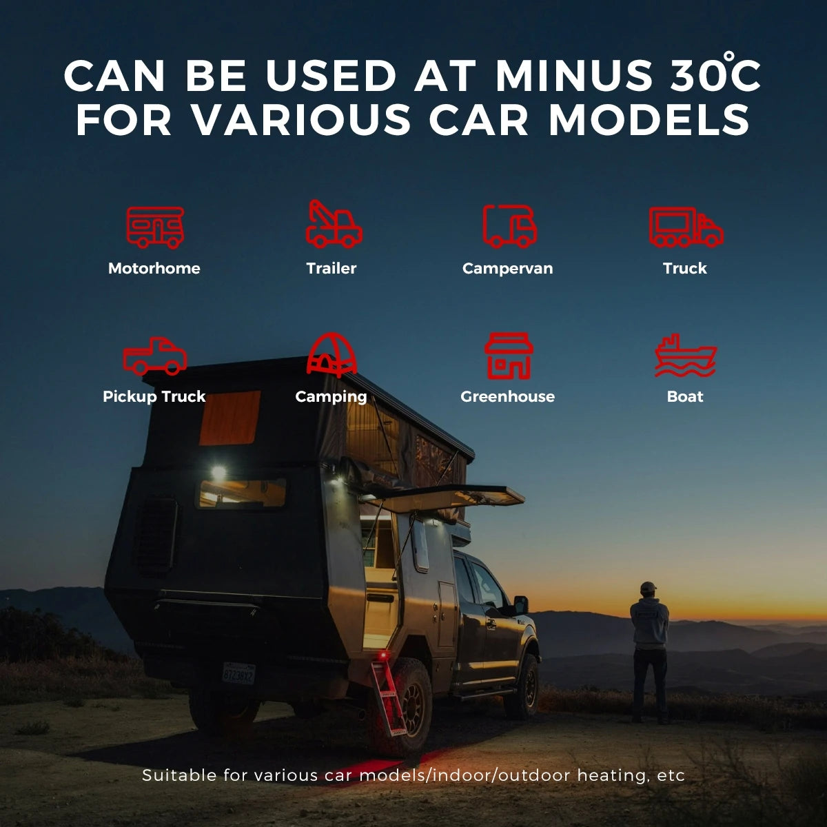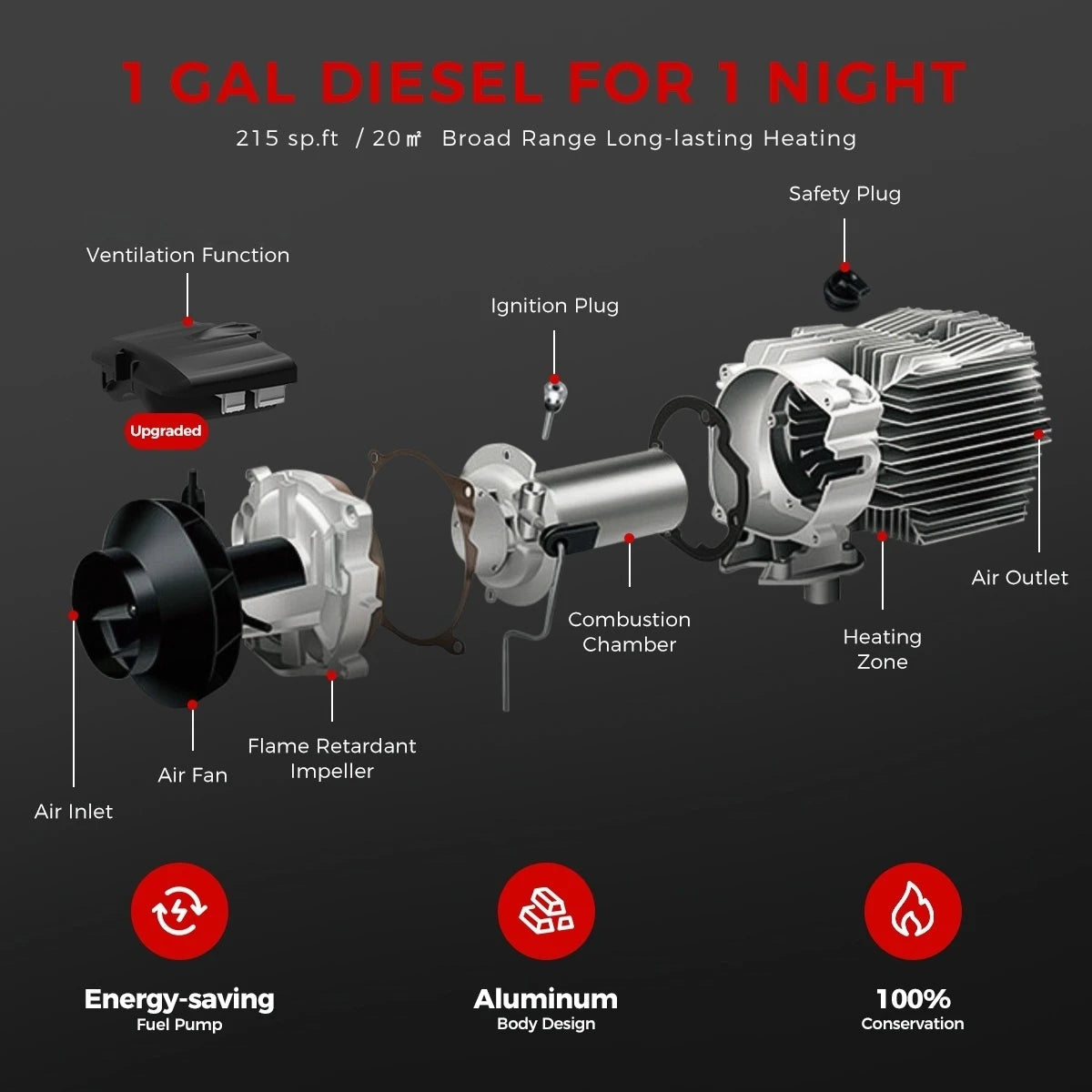 Intelligent constant temperature:The air diesel heater is equipped with intelligent overheating sensor to prevent the heater from running dry and keep the constant temperature; As well as smooth, automatic room temperature control with temperature preset.