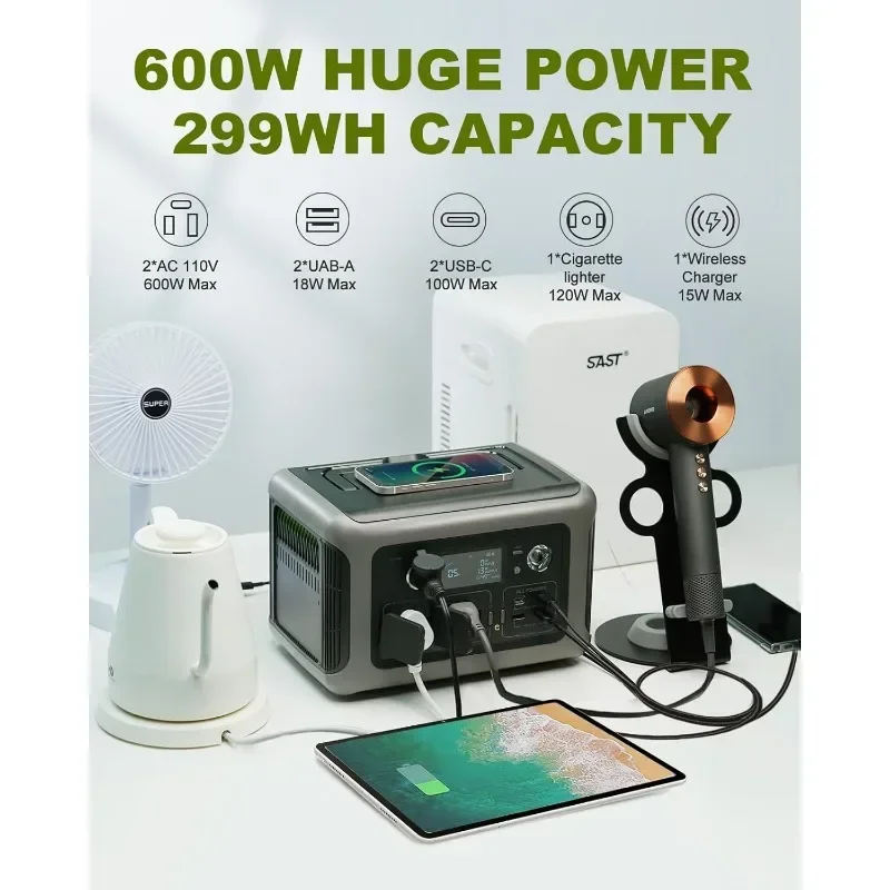 Super-Quiet Portable Power Station, 299Wh 600W LiFePO4 Battery Backup with UPS Function, 400W Max Input, MPPT Solar Generator for Outdoor Camping, RVs, Home Use