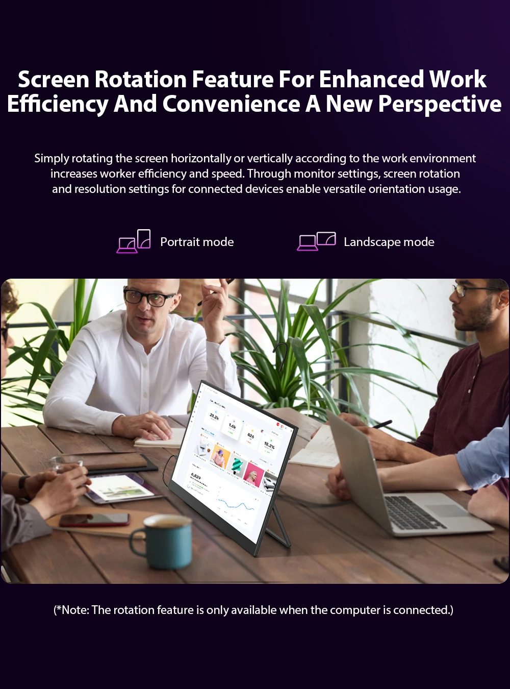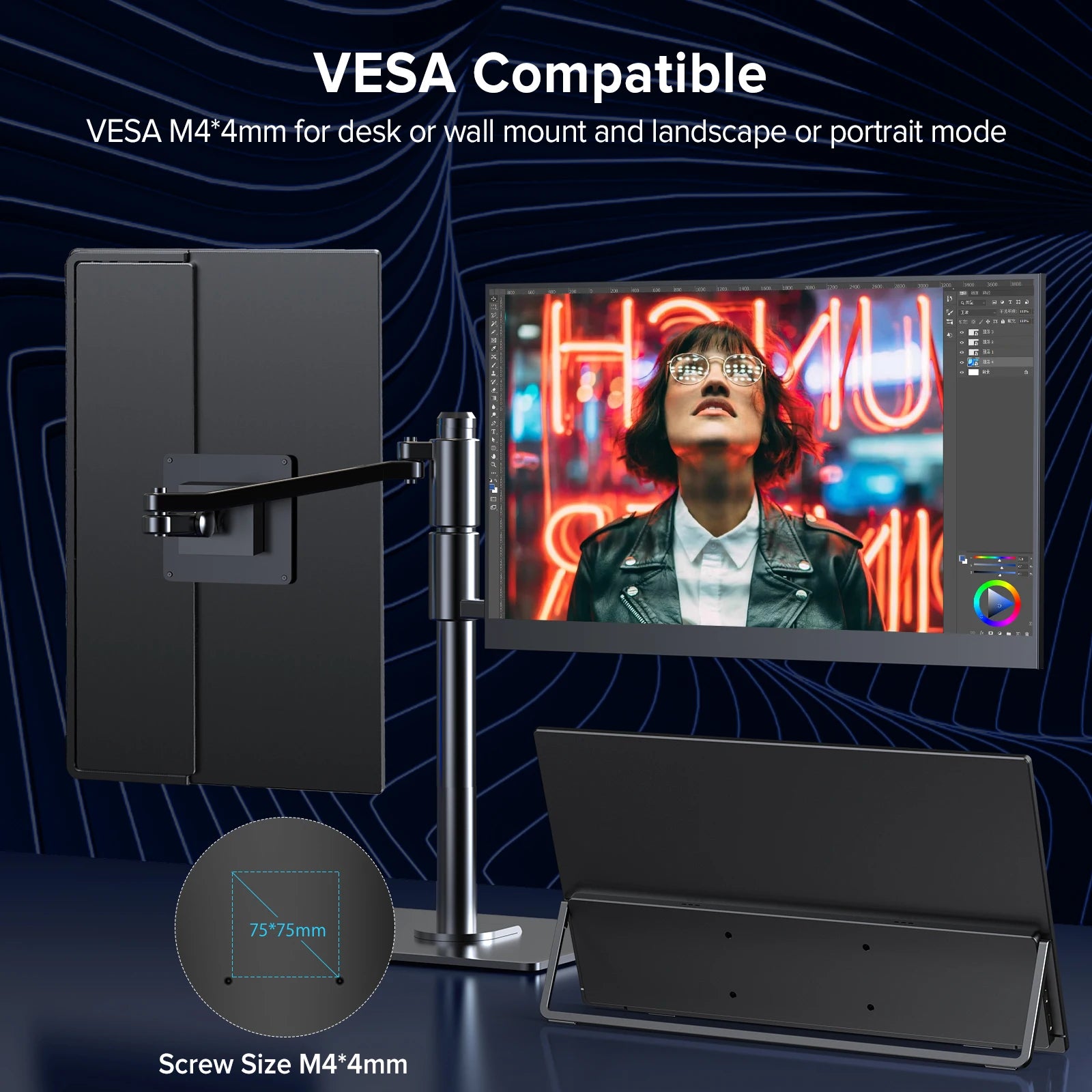 VESA Compatible & Adjustable Kickstand: The standard 75x75 mm VESA holes (M4*4 mm) on the back allows you to mount the monitor to a desktop or wall and set it to landscape or portrait mode as needed