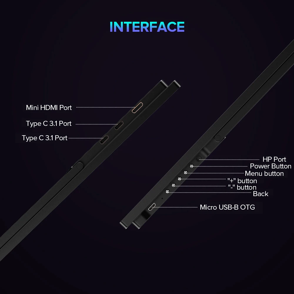Input Interface: Full Function Type-C * 2, Mini HD * 1 ,3.5mm Audio*1,USB OTG *1 (Micro USB-B interface, hard disk data transmission, connecting mouse and keyboards.)