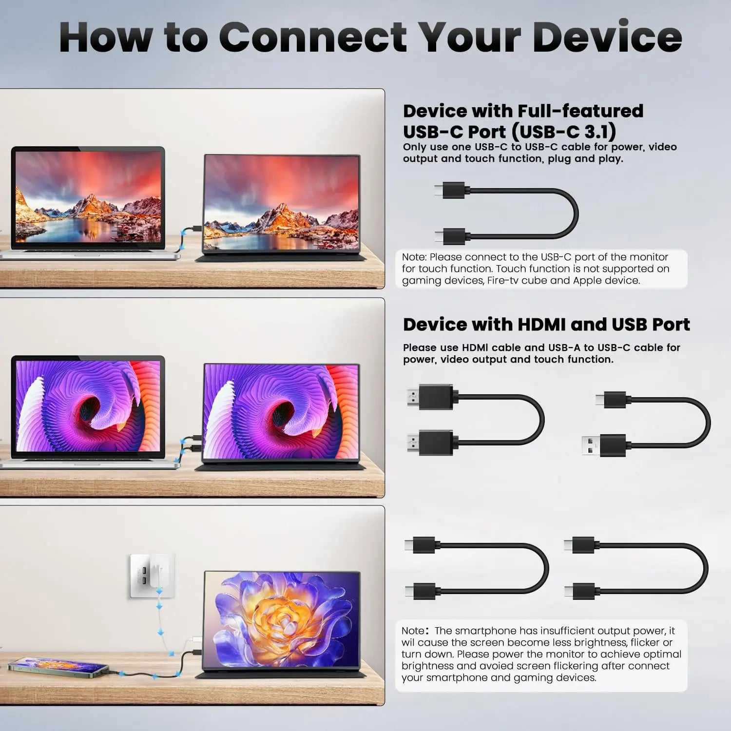 (2)Touchscreen isn't responsive or not working if the phone doesn't support USB3.1.Please check the phone model to ensure if it supports USB3.1.