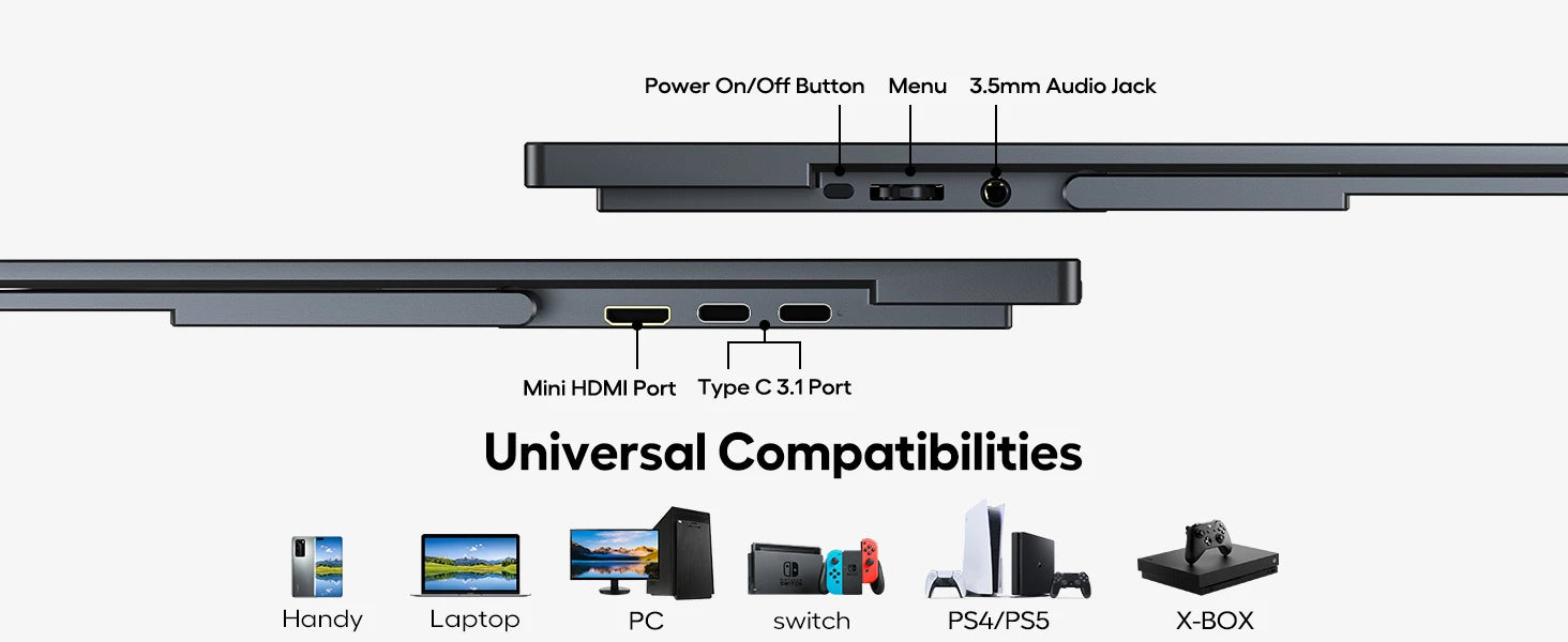 Most computer displays do not have USB-C port, but this 18-inch PC monitor has type-c and mini HDMI interface, which can easily realize signal transmission with various devices, such as Computer, Laptop, Phone, PS4, PS5, Switch ,Tablet, Camera, Camcorder, DVD player, etc.