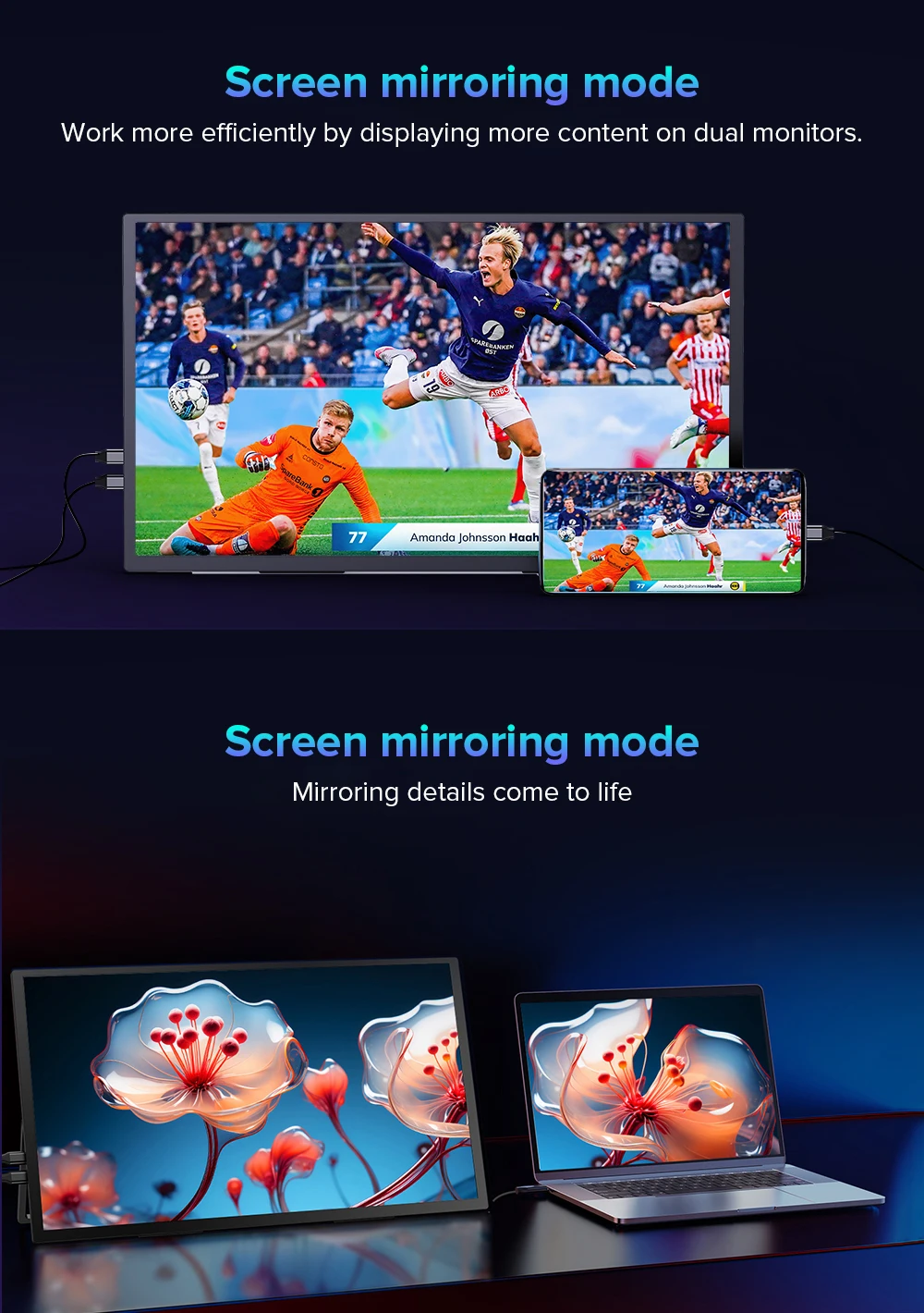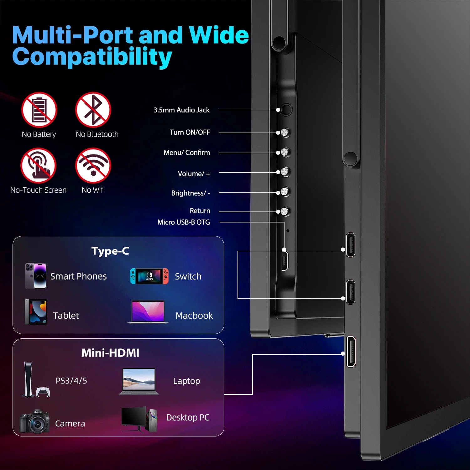 [Two Installation Methods] The 4K 18 inch large gaming monitor has a built-in adjustable stand that can support the monitor on any smooth surface. The back is designed with 4 VESA holes (75*75mm@M4*4mm), which can be installed on a bracket or wall to better fix it next to the computer and use it as a second screen.