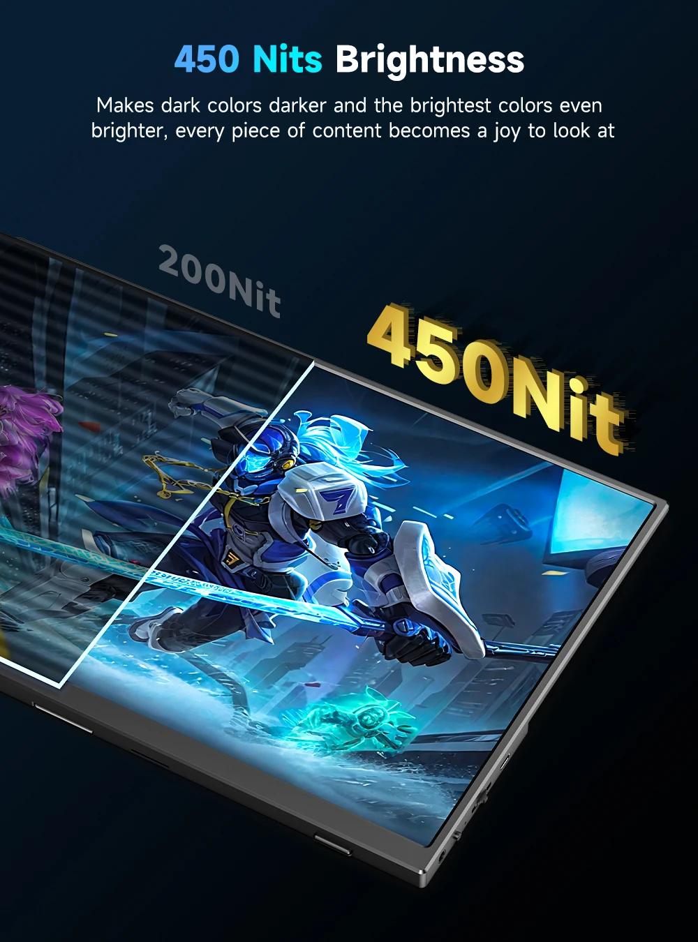【Upgrade 450nits Brightness &1000:1 Contrast】13.4” external screen with wide color gamut - 100% sRGB, 16.7M colors displays, higher contrast ratio - 1000:1, 450 nits brightness, presents you with vivid images, clear motion and details, restore the authenticity of the image & video to a greater extent.