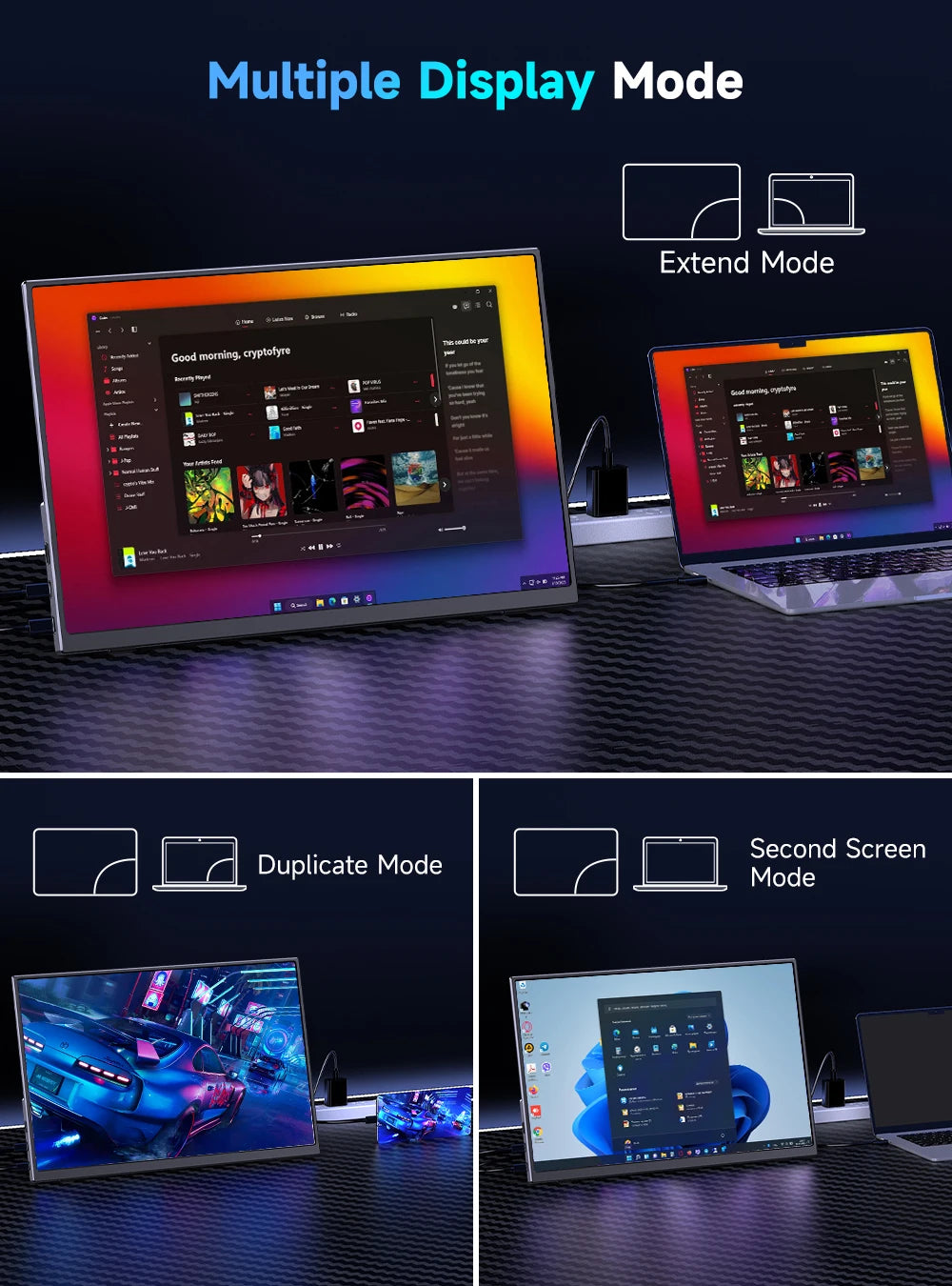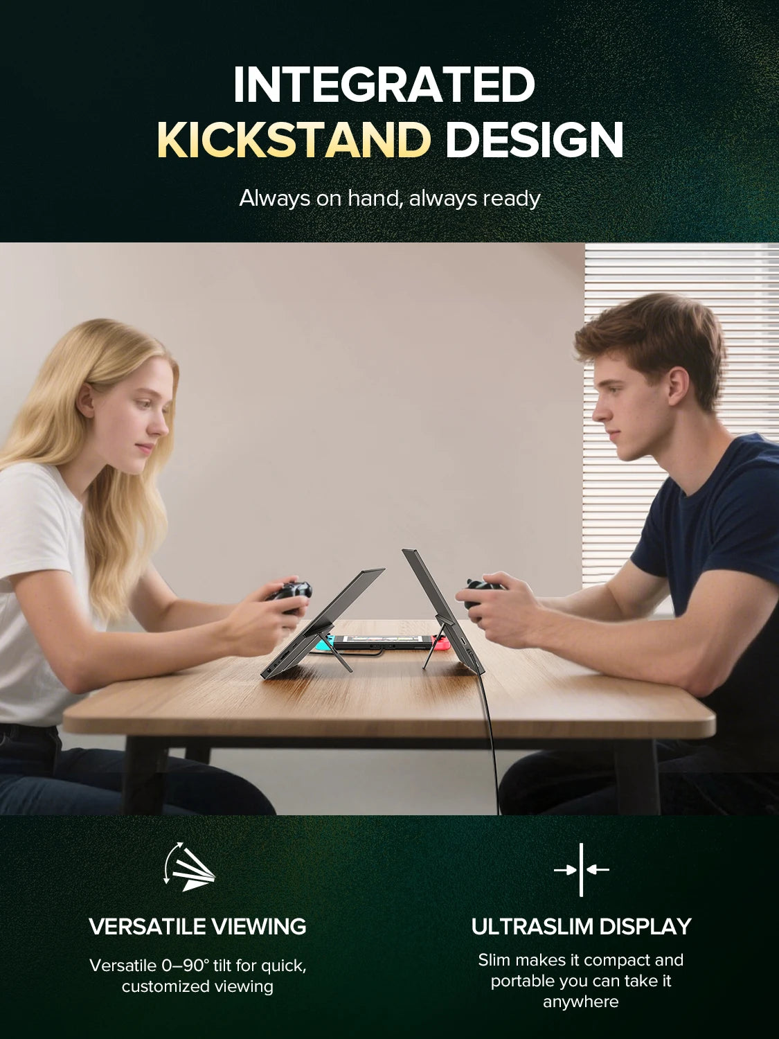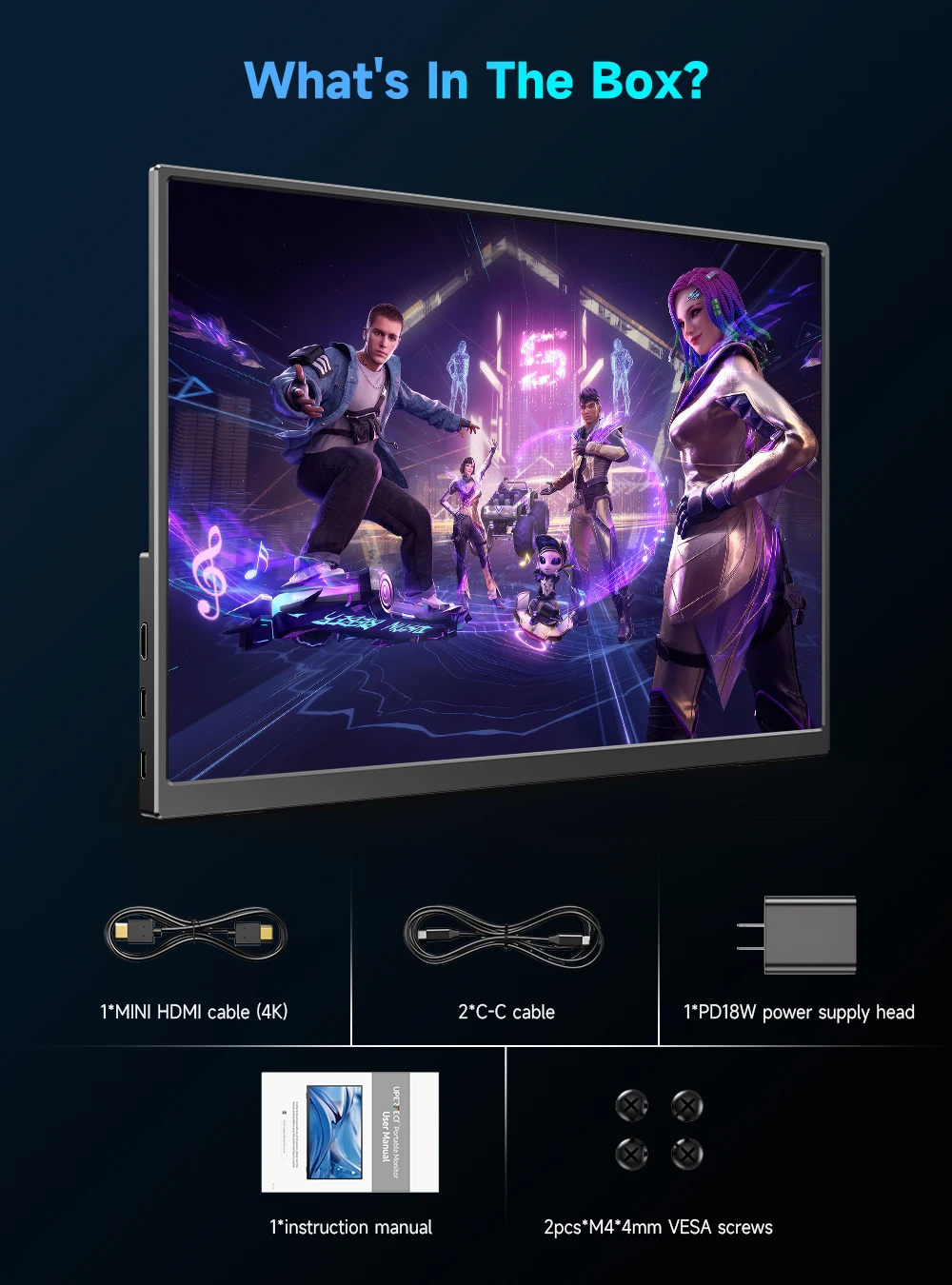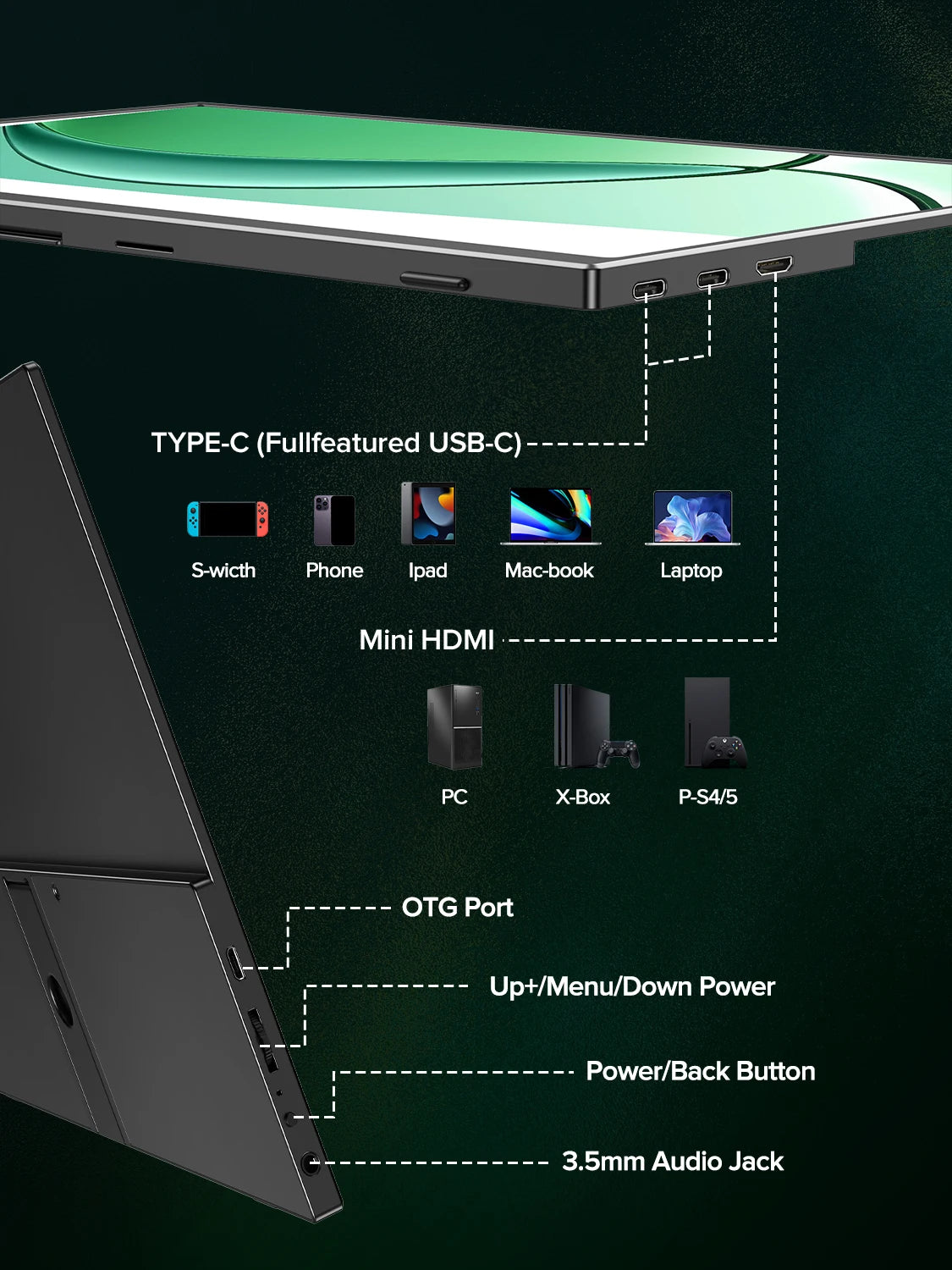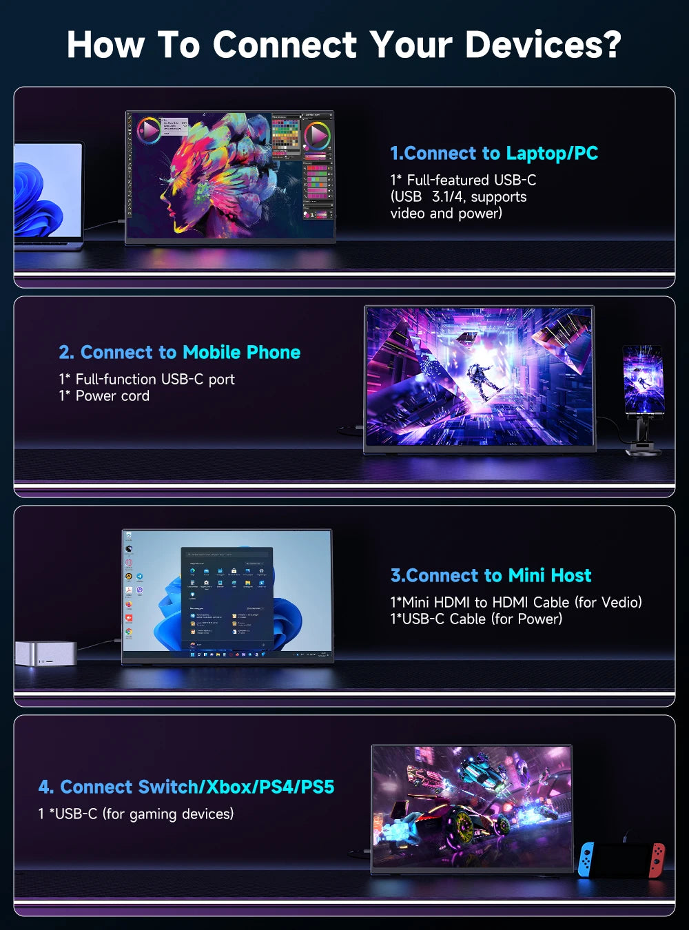 【Plug & Play,Wide Compatibility】13.4" Travel monitor for laptop is equipped with 2 *USB Type-C ports and 1 Mini HDMI port, without multi-wire winding problem. Connect with Mac-book, PS-4/5, X-box,Laptop,PC,Tablet and Phone with ease.