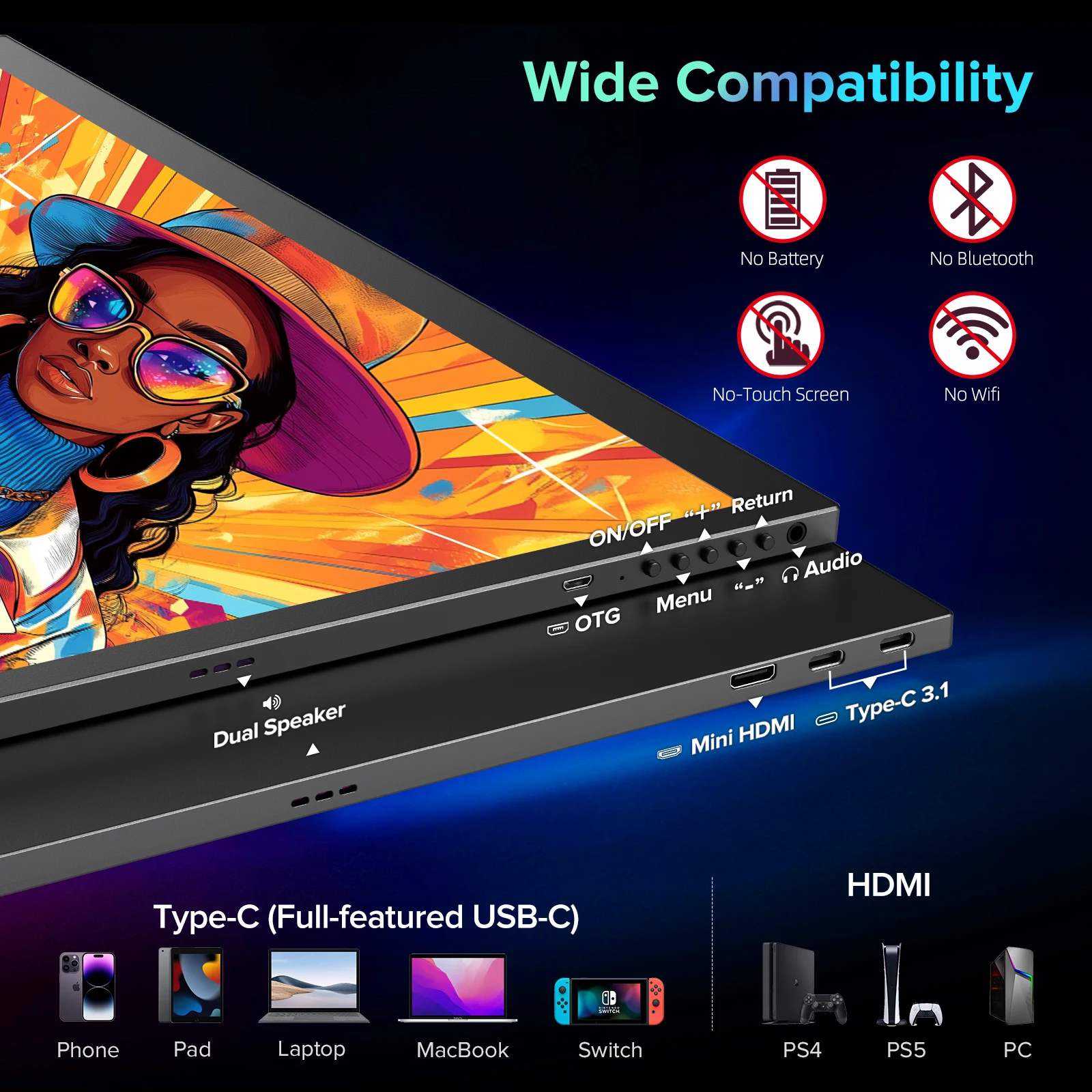 4K display is equipped with full-featured type-c and mini HDMI, perfectly compatible with Xbox, and also can be used for other devices such as PS4s, PS5s, Switches, laptops, computers, smartphones, and various other electronic devices that meet port output.