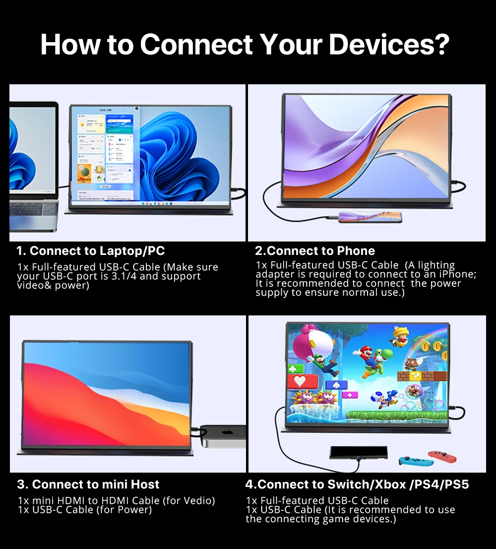 Rich connection terminals, including Mini HDMI, two full-featured Type-C, 3.5mm earphones, compatible with node computers, desktops, smartphones, PS3/PS4, XBOX ONE, Wii or Nintendo Switch and other models. By connecting with the included USB Type-C cable, the computer's video output and power can be performed through a single cable. You can select a mode according to the usage scenario. It is suitable for various scenarios such as PC screen sharing (extended mode), supplementary screen (copy mode), document confirmation (vertical screen display), etc.