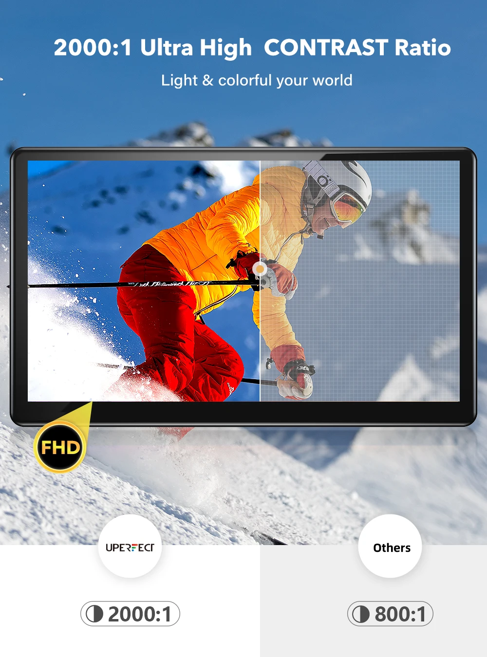 [First Portable Screen with 2000:1 Contrast Ratio]: The 2000:1 high contrast ratio of the hardware will make the screen have better "shading performance", allowing you to see more dark and bright details, but will not overburden the bright parts. It is roughly equivalent to a natural HDR effect of "non-brightness and non-coding". 100% sRGB High Color Gamut deliver you brighter, crisper, and more natural colors.