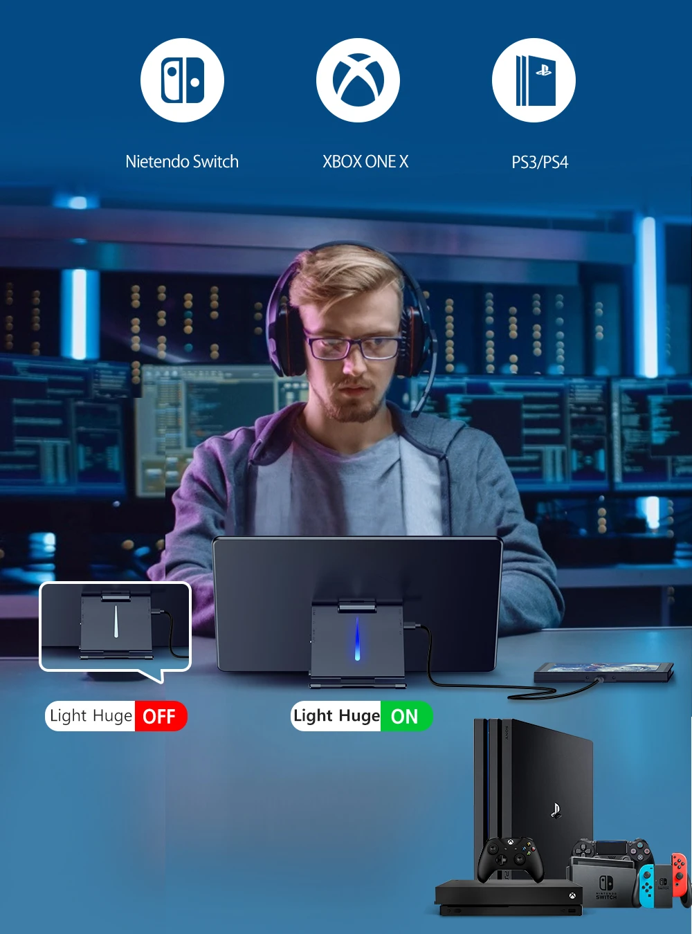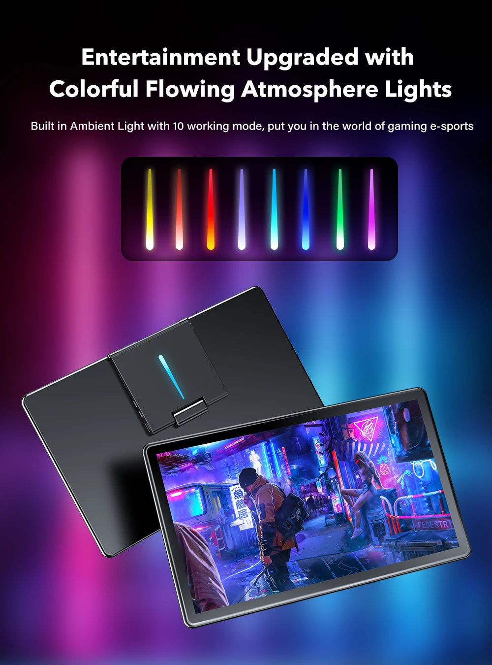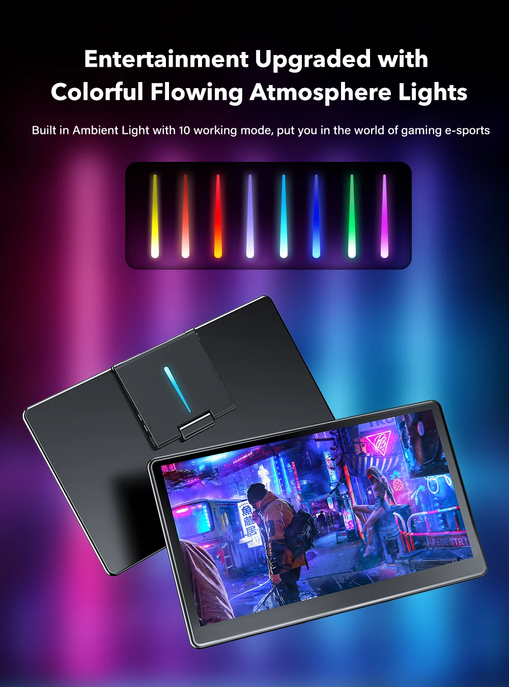 [Entertainment Upgraded with Colorful Flowing Atmosphere Lights]: UPERFECT First portable monitor built in Ambient Light and it has 10 working mode: Vivid, Colorful, White, Purple, Blue, Cyan, Green, Yellow, Orange, Red, put you in the world of gaming e-sports. Low-power Mode has also been added to this monitor, just choose what you need.
