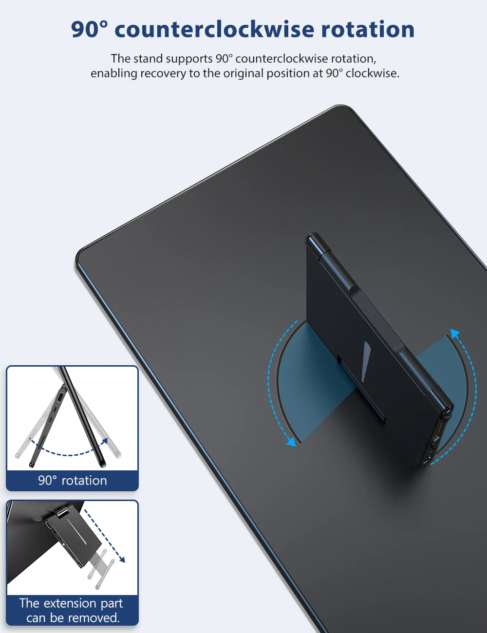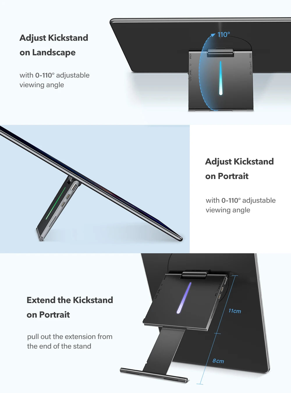 [2025 Innovative Adjustable Kickstand]: The First monitor achieving free switching between landscape and portrait mode in 0-110°adjustable viewing angle, fits your different working requirements perfectly. All ports integrated on the mini kickstand, makes all cables invisible automatically and connections more stable. Before using the monitor, please download and read the User Guide below.